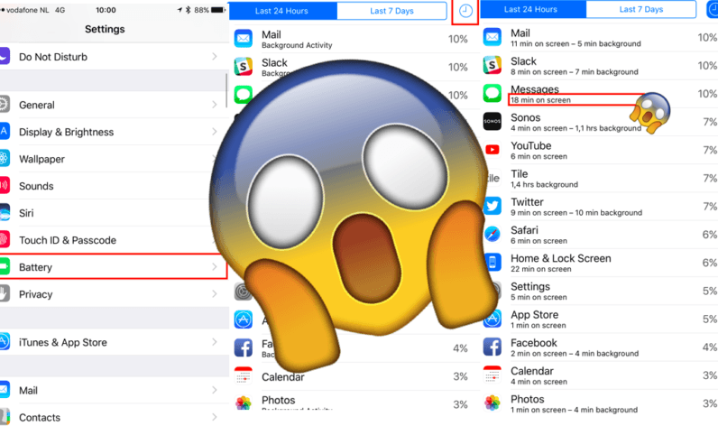 We all feel like we spend too much time on our phones. Notifications keep nagging us, we need to see what happens on Facebook or Twitter, and we feel a constant need to post to Instagram or chat with our friends in WhatsApp. But do we know how much we actually spend in each of those apps? Yesterday I discovered iOS has a very simple view hidden away in the Battery settings that answers exactly that question. Up to the minute. I now know that in the past 24 hours I’ve spent 11 minutes in Mail, 8 minutes in Slack…