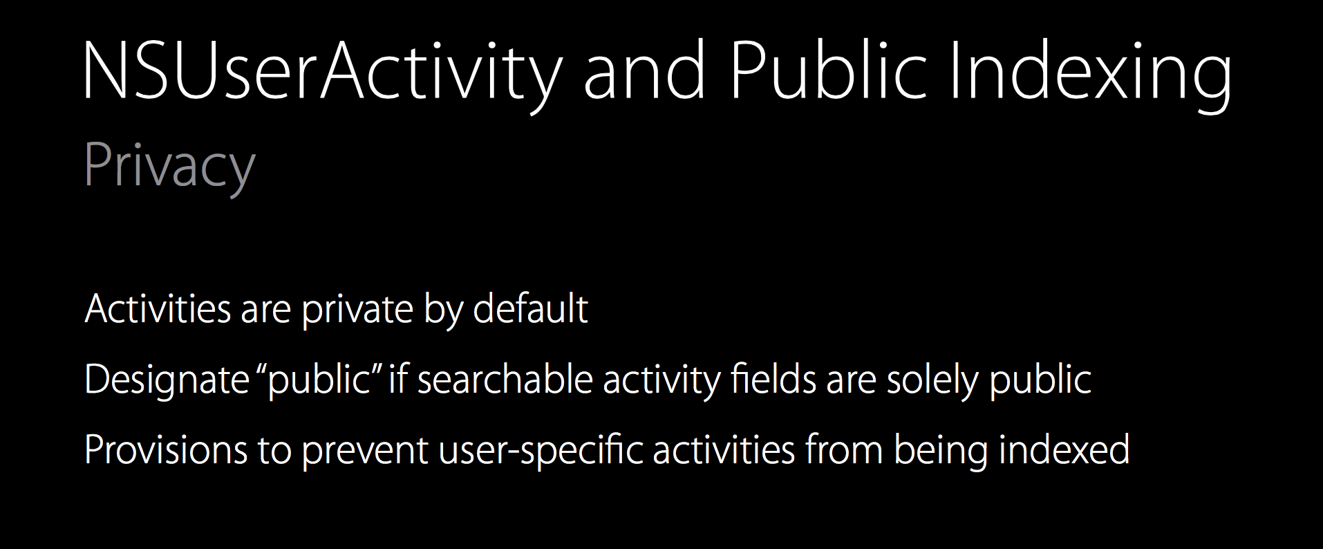 Apple is tackling app indexing with the same tools developers use for Handoff. One of Apple’s main indexing tools, NSUserActivity, now has “new methods and properties that help you index activities and app states to make them available in search results.”